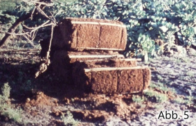 Latten und Draht machten den Ballen (Abb. 5) für den Transport stabiler. Später wurde eine Dreischachtkarusellpresse als passgenaue Einzelanfertigung unter dem Becherelevator verbaut.