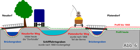 Die Orte Neudorf und Platendorf beseitigten den Schifffahrtskanal, der nur dem König nutzte und ihre Dörfer trennte. Sie schütteten den Kanal zu und schufen die befestigte Dorfstraße (Abb. 6). Den Bau der Straße finanzierten die Kolonisten über eine Bank in Gifhorn und belasteten ihre eigenen Grundstücke mit Grundschulden. Das gesamte Grundstück zwischen den beiden Brückengräben übertrugen die Bürger in das Gemeindeeigentum. Die neue Berme (Abb. 6) wurde auch landwirtschaftlich genutzt.